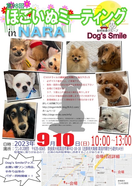 | イベント内容 | 9月10日(日曜日)10時~13時、奈良県大和高田市のワンネス財団エモーショナルリテラシーセンターにて「第98回ほごいぬミーティングat奈良大和高田」を開催します。 保護犬を家族に迎えようと考えている方、保護犬に会ってみたい方、保護犬について知りたい方、ぜひご来場ください。 相性を見るためなど先住わんこさん、卒業わんこさんのご参加ももちろんOKです。 当日は、Dog's smileグッズやワンコ用品の販売、Dog's smileを応援してくださる方々が手作りされた手作り雑貨などの販売も行います。どれもお買い得です。 また、売り上げは、私たちの活動資金になります。ぜひご協力をお願いします。 来場者のみなさまには、コロナウイルス感染拡大防止に御協力をお願いします。 ・発熱・風邪の症状のある方の入場は御遠慮願います。 ・入場時は、手指消毒への御協力をお願いします。 ・来場者の状況により、入場制限を行う場合があります。 なお、来場予定のワンコについては、活動ブログでご確認ください。 日時 令和5年9月10日(日)午前10時~午後1時 場所 ワンネス財団エモーショナルリテラシーセンター 奈良県大和高田市東中2-10-18 (近鉄南大阪駅高田市駅から南に徒歩14分) 協力 ワンネス財団、株式会社松田電気工業 |