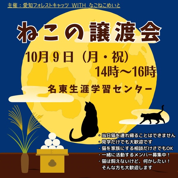 | イベント内容 | 【保護猫の譲渡会】 里親になりませんか? 日時 10月9日(月・祝) 14時〜16時 場所 名東生涯学習センター 名古屋市名東区社が丘3-802 主催 愛知フォレストキャッツ なごねこめいと 地域猫活動やTNR活動の過程などで 保護した猫たち 子猫もいれば、大人猫もいます この時期は3ヶ月〜5ヶ月程度の 子猫が多く参加します 見学、相談だけでも大丈夫! 予約不要、参加費無料なのでお気軽に 猫に関する活動を何かしたい、という方も歓迎です 遊びに来る感覚で、お越しくださいませ ☆猫に関して☆ ・当日は猫を連れ帰ることはできません ・猫を迎えるにあたり、飼育環境などについて お話しをさせていただきトライアル(お試し飼育) から始めさせていただきます ・2週間前後のトライアル期間を経て、問題ない ようであれば、譲渡契約書を結び正式譲渡と なります ・所定の譲渡費用をいただきます |
