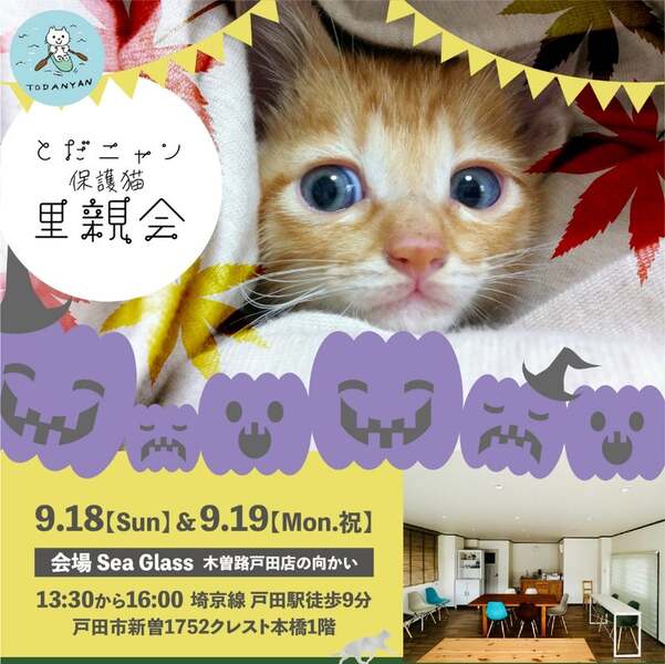 | イベント内容 | とだニャン保護猫プチ里親会を開催します。 【日程】 ①9/17(日)PM13:30〜16:00まで ②9/18(祭)PM13:30〜16:00まで 【場所】 sea glass シーグラス 【住所】 埼玉県戸田市新曽1752 クレスト本橋1階 *埼京線戸田駅(西口)徒歩8分 *北大通り沿い 木曽路戸田店の前にあります *木曽路の裏側にコインパーキング数か所あります *室内開催のため雨天決行です プチ里親会ですので展示頭数は少数。 現在子猫2頭成猫1頭予定しております。 里親会に出る子はブログで随時更新しておりますので是非ご覧になって下さい。 ブログ https://ameblo.jp/sakutotaro203/ 是非、足を運んでみて下さい。 *ご支援のお願い ●フードなんでもOK。開封済OK。賞味期限内でお願いします。 ●トイレシート(レギュラー薄型)とトイレチップをお願いします。 ●募金箱設置します。募金のご協力をお願いします。 以上、よろしくお願いいたします。 主催 とだニャン 協力 sea glass シーグラス |