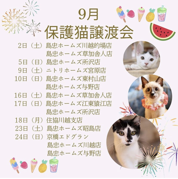 | イベント内容 | 保護猫カフェねこかつさん主催の保護猫譲渡会です? 子猫や大人の猫ちゃんが多数参加致します☺︎ 整理券の配布はございませんのでどなた様もご参加いただけます。 東村山店様では保護猫応援チャリティーで可愛い猫ちゃんグッズの販売もございます。 |