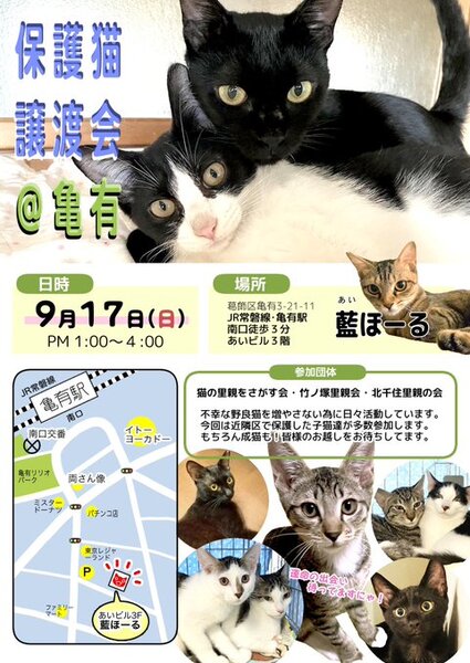 | イベント内容 | 外で生まれた子、遺棄された子、外で暮らしている猫達が皆あたたかな手を必要としています。 そんな猫達を保護して家庭の中で育てています。 その子の個性を良く理解し確実なご縁を繋ぐ為、多くの猫達を保護する事は出来ませんが 大切な出会いを探しています。 お迎えする方の環境や生活スタイルに適した猫さんをご紹介できますので、どういう猫がいいのかと迷っている方へのご相談も受けています。 どうそお気軽にいらしてみて下さい。 保護猫譲渡会@亀有 9月17日(日) 合同譲渡会です。 近隣区で保護した猫達が参加します。 猫の里親をさがす会 https://twitter.com/shosukereiko 北千住里親の会 https://kitasenjusatooyakai.amebawnd.com 竹ノ塚里親会 http://cat.pelogoo.com/satooya/ 手の消毒剤、検温機あり マスク着用、 体調のすぐれない方は見学をご遠慮下さい。 生涯家族の一員としてたっぷり愛情を注いでくださるご家庭をお待ちしております。 ご状況によりご希望に添えない場合もございますのでご了承下さい。 【以下の方には譲渡しておりません】 ・猫の飼育が許可されていない住居にお住まいの方 ・未成年者、友人同士&同棲でお住まいの方 ・乳児のいるご家庭、妊娠中の方 ・お引越し予定の方 ・60歳以上の方への子猫譲渡 ・脱走防止対策にご協力頂けない方 ・経済的に不安定な方(休職中、就職活動中、アルバイト、生活保護等) ・仔猫の場合は留守番の長いご家庭 ・住居の構造を聞かせていただく事があります。(階下への騒音など) ・犬猫を4頭以上飼育している方 他、飼育に適切でないと判断した場合や個体により条件が違う場合があります。 【当里親会は猫さんと里親様とのマッチングを大切にしています】 はじめて猫さんをお迎えする場合に適した猫さん、お留守番の長い里親さんに適した猫など、ご状況に合わせてアドバイスしています。 【ご負担頂く費用について】 譲渡の際に活動協力金を里親様にご負担頂く事により飼い主のいない猫の継続的治療や保護、新しいご家族の元へ送り出す事ができます。 ご理解とご協力をお願い致します。 ◆活動協力金(譲渡費用)のご負担がございます。 ★仔猫 1頭20.000 ★成猫 1頭25.000 ★成猫(マイクロチップ挿入済み)1頭30.000 全ての猫はワクチン・ウイルスチェック・駆虫が済んでいます。 生後6ヶ月以降~成猫は不妊去勢手術済が済んでいます。 ★猫をお届けする時の交通費をいただいております。1500〜実費 【譲渡の条件がございます】 ①終生飼育 ②完全室内飼育 ③未手術子猫は適正時期の不妊・去勢手術 ④譲渡負担金 ⑤身分証提示&契約書の署名捺印 ⑥定期報告義務(トライアル中こまめに、譲渡後1.3.6ケ月、1年に一度 ⑦二次譲渡の禁止 以上をご了承ください。 トライアル期間は全ての猫さんに設けております。 トライアル期間を経て初めて正式譲渡となります /////////////////////////////////////// https://twitter.com/shosukereiko 【里親さん募集中の猫~猫の里親をさがす会別館】 http://behappynyans.blog.fc2.com/blog-entry-13.html 【猫の里親をさがす会】 https://blog.goo.ne.jp/bobton |