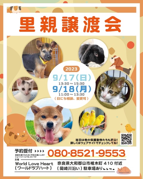 | イベント内容 | ワールドラブハートで里親募集中の動物たちの譲渡会を開催します! 犬猫だけではなく、インコやラット、ウサギにモルモットなどたくさんの保護動物がいます! みんな新しい家族を探しています。写真だけでは伝えきれない魅力が盛りだくさん! 実際に会ってそのかわいさを実感してください♪ ★里親募集中の動物たち★ https://satoya-boshu.net/foster/?@button_name@=search&FosterParent_MemberID=1161 ・犬、猫 ・ウサギ ・モルモット ・ファンシーラット ・スキニーラット ・インコ ・キンカチョウ ・ウコッケイ ・ヘビ ・カメ ……など 子犬や子猫もたくさんいますよ♡ ぜひお気軽にお越しください! ●混雑をさけるために、事前予約をお願いします。 予約番号080-8521-9553 ショートメールでも可♪ ●当日までに譲渡が決定した・体調がすぐれないなど、やむを得ない理由で不参加の場合があります。ご希望の子がいましたら、当日お問い合わせください。 ●当日、その場での引き渡しはしておりません。譲渡決定後、自宅訪問を兼ねてこちらからお届け致します。 ご来場お待ちしております♪ ★world love heart(ワールドラブハート)は、奈良県大和郡山市で活動している動物保護団体です。 『引き取り依頼は断らない』をモットーに、犬、猫、鶏、小動物、家畜、爬虫類など捨てられた動物を保護しています。 https://worldloveheart-nara.jimdofree.com |