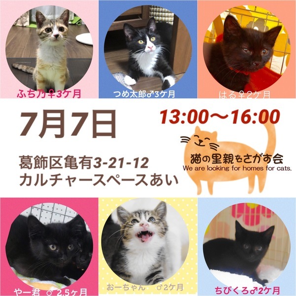 | イベント内容 | 猫の里親会@亀有ちびにゃんず 【猫の里親会@亀有】 JR亀有駅より徒歩3分 《日時》 7月7日(日)午後1時~3時半 《場所》 東京都葛飾区亀有3-21-12 カルチャースペースあい 室内開催 ご予約は不要です、お気軽にいらっしゃってください。 《アクセス》 JR亀有駅南口から徒歩3分 お車でお越しの方はお近くのコインパーキングをご利用ください。 ご家族の皆様で生涯、家族の一員としてたっぷり愛情を注いでくださるご家庭をお待ちしております。 ご希望に添えない場合もございますのでご了承下さい。 【以下の方には譲渡しておりません】 ・猫の飼育が許可されていない住居にお住まいの方 ・未成年者、友人同士&同棲でお住まいの方、乳児のいるご家庭 ・高齢者のみのご家庭の方 ・脱走防止対策にご協力頂けない方 ・経済的に不安定な方(休職中、就職活動中、アルバイト等) ・単身者の場合には別途条件 ※60~65才だけの世帯の場合は、飼育経験や環境、猫の性格を考慮し飼いきれる年齢の猫をご紹介しています。 【当里親会は猫さんと里親様とのマッチングを大切にしています】 はじめて猫さんをお迎えする場合に適した猫さん、お留守番の長い里親さんに適した猫さん等、 お迎えする不安など経験豊富なスタッフがお話を聞き、アドバイスさせていただいています。 お気軽にお声をかけてください♪ 【ご負担頂く費用について】 譲渡の際に譲渡負担金(医療費の一部、譲渡金、お届け時の交通費)を里親様にご負担頂く事により 飼い主のいない猫の継続的治療や保護、新しいご家族の元へ送り出す事ができます。 ご理解とご協力をお願い致します。 ◆ご負担頂く医療費につきましては個々の猫(子猫、成猫、♂、♀)によって異なります◆ ★仔猫10.000~14.000 (ワクチン・ウイルスチェック・駆虫) ★成猫15.000~20.000 (ワクチンウイルスチェック・駆虫・不妊去勢手術済) ★猫をお届けする時の交通費をいただいております。 1500〜実費 【譲渡の条件がございます】 ①終生飼育 ②完全室内飼育 ③不妊・去勢手術 ④譲渡負担金 ⑤契約書の署名捺印 ⑥定期報告義務 をご了承ください。 ●当日譲渡会場での引き渡しはございません。 ●お迎え準備が整いましたらご自宅にお届けしトライアル開始となります。トライアル期間は全ての猫さんに設けております。 ●トライアル期間を経て初めて正式譲渡となります 【譲渡の流れ】 気に入った猫がいましたらお申込みアンケートにご記入いただきます ↓ 審査&ご相談 ↓ 飼育に必要な物のご用意 ↓ お届け ↓ トライアル(猫によって期間が変わります) ↓ 正式譲渡(契約書へのサインをお願いします) 猫の為に何かできることはないか?!と思っておられる方 私達のお手伝いをしていただけませんか? ☆猫の預かりさん募集しています 乳飲み子・仔猫・成猫 預かりさんの状況に合わせてお願いしています。 里親さんが決まるまでの一定期間だけ、お世話してくださる猫好きな方大歓迎(^^) 【猫の里親をさがす会】 https://blog.goo.ne.jp/bobton @shosukereiko |
