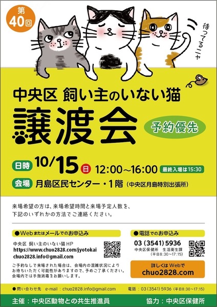 | イベント内容 | 中央区では様々な事情で飼い主のいないネコ達にずっとのおうちを見つけるために中央区動物との共生推進員が中心となって、譲渡会を定期開催しており今回で40回目を数えます。 区内の高齢者からの引き取りネコなど大人猫はもちろん、まだ小さな子猫まで参加予定です。 初めてでも飼いやすい、お留守があっても大丈夫な手術済みの体調が安定した子猫もおります。 ネコとの暮らしをご希望されている方、ネコのお預り希望の方、またネコとの暮らしについて色々ご質問がおありになる方、皆様のご来場をお待ちしております。 ※中央区およびその周辺在住の方を優先させていただきます。保護主によっては遠方へのお届けが難しい場合がございます。 ※里親を希望される方は、身分を証明できる物をご持参の上、当日会場まで直接お越し下さい。 ※お届けやフォローの都合上、中央区近郊の方を優先させていただきます。 ※会場内の混雑を防ぐため、事前に来場希望時間と来場予定人数をご連絡ください。 <譲渡会> 開催日:2023年10月15日(日曜日) 開催時間:12:00〜16:00(最終入場時間15:30) 会場:中央区月島区民センター 1階会議室 譲渡会の事前お申し込みはこちらから → https://www.chuo2828.com/jyotokai 里親さま募集中の猫ちゃんはこちら → https://www.chuo2828.com/catslist 参加猫の情報は、譲渡会の1週間前くらいにWebに掲載する予定です。 今回も1匹でも多くの猫さんたちに、新しい家族とのご縁が繋がりますように。 |