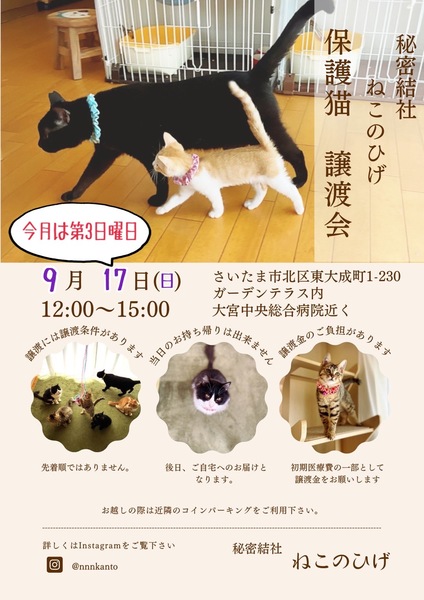 | イベント内容 | 【秘密結社ねこのひげ♡保護猫譲渡会】 9/17(日) 12:00~15:00 さいたま市北区東大成町1-230 金子建材内 ガーデンテラスにて 保護猫譲渡会を開催します☆ ワラワラワラワラ仔猫祭り~♪ ワラワラワラワラ黒仔猫祭り~♪ &まだまだ子猫だにゃー! なヤング猫も数頭♪ 合計20頭ほどが参加予定です♪ 未来のご家族さまと 愛し愛されな 両想いになれますように♡ 家族にするなら保護猫だべ♪♪ こんなご時世だけど 新しい家族と笑顔で暮らしたい♪ という方は是非会いにいらしてください♡ ご不明な点がございましたら インスタグラム @秘密結社ねこのひげ の DMまでお問い合わせ下さい☆ |