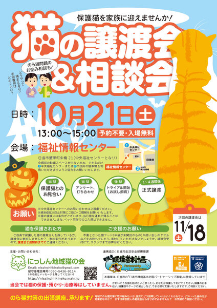| イベント内容 | 10月21日(土)に「猫の譲渡会&相談会」を開催いたします。 猫少なめのミニ譲渡会&相談会です。 保護猫を迎えたい方はもちろん、猫に関する相談会も同時開催しておりますので、ご近所との猫トラブルなどでお悩みの方もお気軽にお立ち寄りください! 地域猫活動やペット防災についての展示もございます(^^)/ 【日時】2023年10月21日(土)13:00〜15:00 【会場】福祉情報センター(中央福祉センターとなり) 【主催】にっしん地域猫の会 【ホームページ】https://nissinchiikineko.main.jp ※重症化リスクの高い方々が多く利用される福祉センターの施設をお借りしているため、引き続き感染症拡大防止にご理解・ご協力をお願いいたします(受付名簿のご記入、室内の人数制限など)。 ※会場前に駐車場がございますが、数が少ないため、満車時は中央福祉センターの駐車場をご利用ください。図書館のむかいにある市役所の臨時駐車場もご利用いただけます。 ※室内換気のため冷房・暖房が効きにくい場合がございます。 ※ペット同伴のご入場はできませんので、予めご了承ください。 ※譲渡会に関しまして、福祉センターへのお問い合わせはご遠慮ください。 ※猫ちゃんの譲渡には条件がございます。詳細はホームページをご参照ください。 |