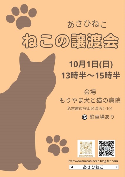 | イベント内容 | \譲渡会を開催します!/ 優しい家族を待っている猫たちが 沢山参加します? ♡猫を迎えたい ♡運命の猫ちゃんと出会いたい ♡猫ちゃんと家族になりたい そんな方のご来場を お待ちしております! 【譲渡会情報】 ?️2023年10月1日(日) ?13:30〜15:30 ※毎月第1日曜日 会場 ?もりやま犬と猫の病院 愛知県名古屋市守山区深沢2-101 ?️駐車場あり ┈┈┈┈┈┈┈┈┈┈ ◎全頭ワクチン接種、ウイルス(FIV、FeLV)検査、マイクロチップ装着済み ◎譲渡には条件がございます 詳しくは下記ブログをご覧ください ↓↓↓ 主催者【あさひねこ】ブログ http://owariasahineko.blog.fc2.com/ |
