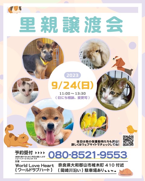 | イベント内容 | ワールドラブハートで里親募集中の動物たちの譲渡会を開催します! 犬猫だけではなく、インコやラット、ウサギにモルモットなどたくさんの保護動物がいます! みんな新しい家族を探しています。写真だけでは伝えきれない魅力が盛りだくさん! 実際に会ってそのかわいさを実感してください♪ ★里親募集中の動物たち★ https://satoya-boshu.net/foster/?@button_name@=search&FosterParent_MemberID=1161 ・犬、猫 ・ウサギ ・モルモット ・ファンシーラット ・スキニーラット ・インコ ・キンカチョウ ・ウコッケイ ・ヘビ ・カメ ……など 子犬や子猫もたくさんいますよ♡ ぜひお気軽にお越しください! ●混雑をさけるために、事前予約をお願いします。 予約番号080-8521-9553 ショートメールでも可♪ ●当日までに譲渡が決定した・体調がすぐれないなど、やむを得ない理由で不参加の場合があります。ご希望の子がいましたら、当日お問い合わせください。 ●当日、その場での引き渡しはしておりません。譲渡決定後、自宅訪問を兼ねてこちらからお届け致します。 ご来場お待ちしております♪ ★world love heart(ワールドラブハート)は、奈良県大和郡山市で活動している動物保護団体です。 『引き取り依頼は断らない』をモットーに、犬、猫、鶏、小動物、家畜、爬虫類など捨てられた動物を保護しています。 https://worldloveheart-nara.jimdofree.com |