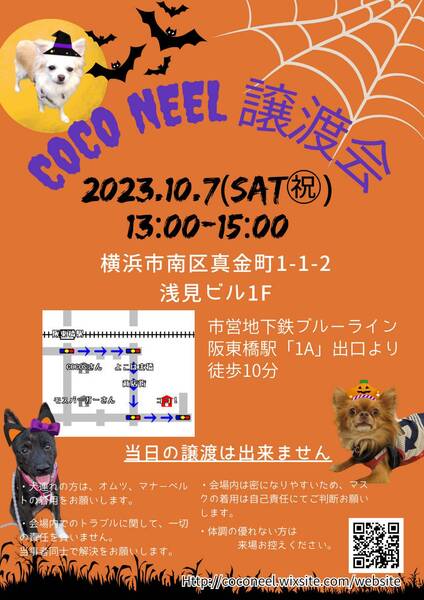 | イベント内容 | COCO NEEL譲渡会IN横浜 2023.10.6(土) ・会場・ 横浜市南区真金町1-1-2 浅見ビル1F 駐車場の用意はありません。 近隣のコインパーキングのご利用をお願いいたします。 ・時間・ 13:00~15:00 ※参加犬詳細はブログでご確認お願いします。 https://ameblo.jp/coconeel-animalrights |