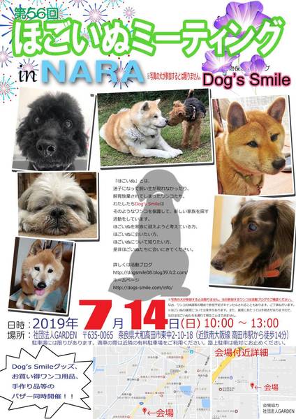 | イベント内容 | 7月14日(日曜日)、奈良県大和高田市内にて「第56回ほごいぬミーティング」を開催します。 保護犬を家族に迎えようと考えている方、保護犬に会ってみたい方、保護犬について知りたい方、ぜひご来場ください。 相性を見るためなど先住わんこさん、卒業わんこさんのご参加ももちろんOKです。 当日は、Dog's smileグッズやワンコ用品の販売、Dog's smileを応援してくださる方々が手作りされた手作り雑貨などの販売も行います。どれもお買い得です。 また、売り上げは、私たちの活動資金になります。ぜひご協力をお願いします。 なお、来場予定のワンコについては、活動ブログでご確認ください。 日時 令和元年7月14日(日)午前10時~午後1時 場所 一般財団法人ワンネスグループ奈良GARDEN 奈良県大和高田市東中2丁目10-18 (近鉄南大阪線高田市駅から南西に徒歩14分) 協力 一般財団法人ワンネスグループ 8月のほごいぬミーティングは、8月11日(日)、今回と同じく奈良GARDENさんをお借りして開催する予定です。 |