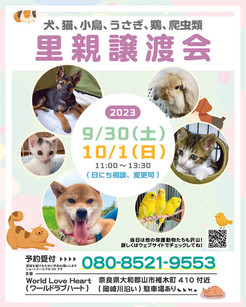 | イベント内容 | ワールドラブハートで里親募集中の動物たちの譲渡会を開催します! 犬猫だけではなく、インコやラット、ウサギにモルモットなどたくさんの保護動物がいます! みんな新しい家族を探しています。写真だけでは伝えきれない魅力が盛りだくさん! 実際に会ってそのかわいさを実感してください♪ ★里親募集中の動物たち★ https://satoya-boshu.net/foster/?@button_name@=search&FosterParent_MemberID=1161 ・犬、猫 ・ウサギ ・モルモット ・ファンシーラット ・スキニーラット ・インコ ・キンカチョウ ・ウコッケイ ・ヘビ ・カメ ……など 子犬や子猫もたくさんいますよ♡ ぜひお気軽にお越しください! ●混雑をさけるために、事前予約をお願いします。 予約番号080-8521-9553 ショートメールでも可♪ ●当日までに譲渡が決定した・体調がすぐれないなど、やむを得ない理由で不参加の場合があります。ご希望の子がいましたら、当日お問い合わせください。 ●当日、その場での引き渡しはしておりません。譲渡決定後、自宅訪問を兼ねてこちらからお届け致します。 ご来場お待ちしております♪ ★world love heart(ワールドラブハート)は、奈良県大和郡山市で活動している動物保護団体です。 『引き取り依頼は断らない』をモットーに、犬、猫、鶏、小動物、家畜、爬虫類など捨てられた動物を保護しています。 https://worldloveheart-nara.jimdofree.com |