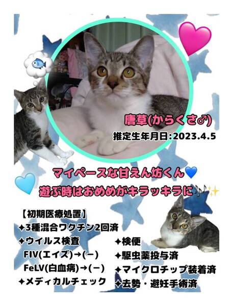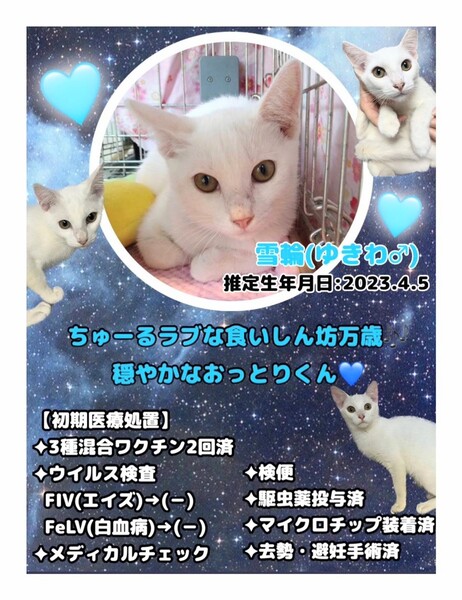 | イベント内容 | 【秘密結社ねこのひげ♡保護猫譲渡会】 10/1(日) 11:30~14:30 川越市藤間27-1 高階公民館 講座室1号内 にて開催します☆ すくすくと成長している 安心な月齢(4~5ヶ月)な仔猫たちが20頭ほどと♪ 5才までは子猫だにゃー!なヤング猫や まだまだ若いもんにゃ負けないにゃー!な オトナ猫たちも数頭ワクテカで参加します♪ 未来のご家族さまと 愛し愛されな 両想いになれますように♡ 家族にするなら保護猫だべ♪♪ こんなご時世だけど 新しい家族と笑顔で暮らしたい♪ という方は是非会いにいらしてください♡ 新型コロナ対策として 受付名簿のご記入、消毒 マスク着用などのご協力をお願い致します。 ご不明な点がございましたら インスタグラム @秘密結社ねこのひげ の DMまでお問い合わせ下さい。 |