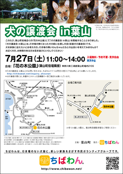 | イベント内容 | 葉山町役場主催でお声掛けいただきまして、5回目の参加です。 本当の家族との出会いを待つ可愛い保護犬たちが皆様のご来場をお待ちしております。 ※暑い時期でもありますので、犬たちの健康を考え、終了時間が早まることがあります。 詳細はちばわんイベント情報下記URLをご覧ください。 http://chibawan.net/event_other/20190727-hayamamachi-dog |