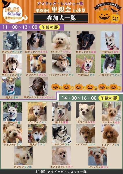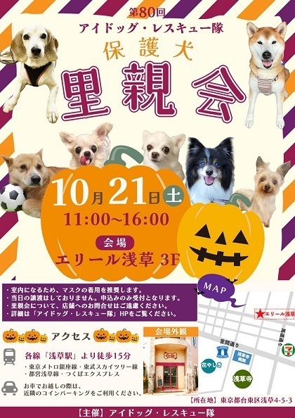 | イベント内容 | 第80回 アイドッグ里親会のお知らせin浅草 ⭐️日時:10月21日(土) 午前の部 11:00~13:00 午後の部 14:00~16:00 ※入れ替え制 ⭐️会場:浅草エリール3階(ローソン隣) https://erile.co.jp/ ⭐️住所:東京都台東区浅草4-5-3 ⭐️ アクセス:浅草駅より徒歩15分 (東京メトロ銀座線・東武スカイツリー線・都営浅草線・つくばエクスプレス) ※室内は密になりやすいため、マスク の着用を推奨します ※犬をお連れの方は、オムツやマナーベルトの着用をお願い致します フリーで遊ばせることは出来ませんので、リードの着用をお願い致します 〜皆様のお越しをお待ちしています 〜 |
