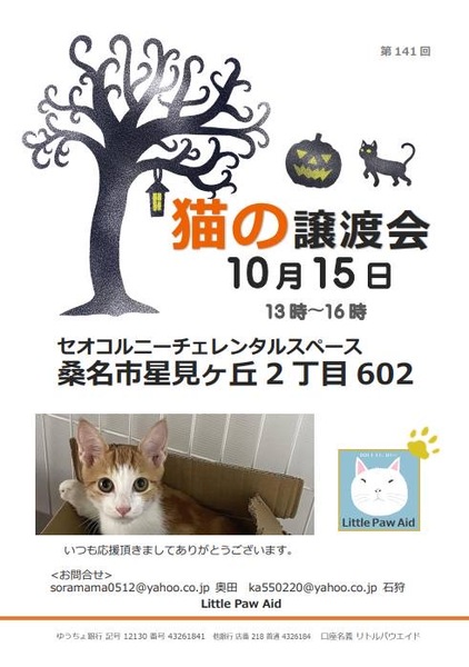 | イベント内容 | 日時 10月15日(日) 13時~16時 場所 セオコルニーチェレンタルスペース 三重県桑名市星見ヶ丘2丁目602 子猫から中猫や成猫たくさん参加します。 みんな個性的で可愛い子たちです 猫を飼いたいと思っている方も猫を見てみたいと思っている方もお気軽に遊びに来て下さい それぞれの保護主により譲渡条件があります 当日猫を連れ帰る事はできません。 参加猫は保護主のブログで確認ください。 ◆参加者 リトルパウエイド https://blog.goo.ne.jp/ka550220/e/da0fa7f743a938b9030d35e95e0a0263 猫小屋の住人 http://link.blogmura.com/out/?ch=00550414&url=http%3A%2F%2Fnekogoyaokan.blog.fc2.com%2F http://blog.livedoor.jp/cats_voice_pawaid/ ほんわか猫な日々 https://blog.goo.ne.jp/soramama はるごまいけのブログ http://ameblo.jp/harugoma3futagozaru/ 来場者様へお願い 感染拡大を防ぐため 会場内での 入出時の手の消毒 定期的な換気 マスク等の着用推奨 混雑時入場をお待ち頂きます ご理解とご協力をお願いします 予約は不要です 連絡先 soramama0512@ezweb.ne.jp |