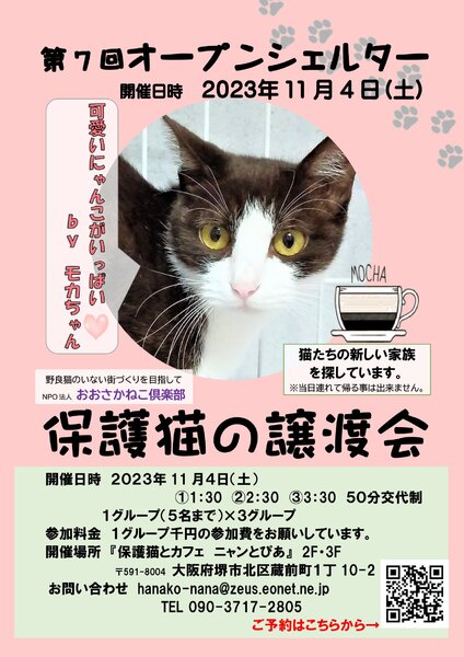 | イベント内容 | 第7回オープンシェルター譲渡会 ☆11月4日(土)13時30分から ☆にゃんトピア上の2階3階で 開催します 詳しくはホームページをご覧下さい。 ☆靴下、マスクの着用をお願いします。 ☆お車の方は、レインボーの タイムズをご利用下さい。 (植田クリニック横を曲がって 下さい) ☆先日の譲渡会で、聡太くんと エイズのリボンちゃんに トライアルのお申し出が ありました? |