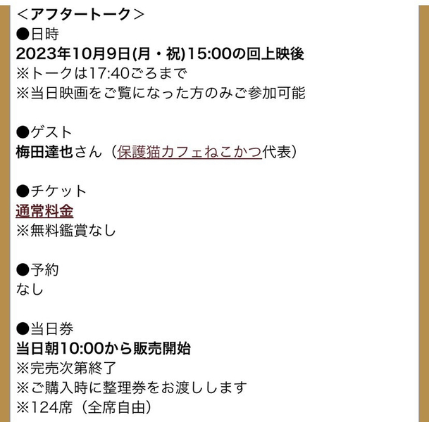 | イベント内容 | ★10/9(月祝):保護猫譲渡会&アフタートークin川越スカラ座 川越スカラ座様で猫好きさん必見のドキュメンタリー映画 『猫と、とうさん』が現在上映中です☆*:. 10月9日(月祝)の映画上映後、 ねこかつ代表のアフタートークと 保護猫譲渡会が行われます 猫好きさんならぜひ見たい映画とトーク、 譲渡会は珍しく夕方から映画館内で開催です 男性も女性もお子様も! 猫好きさん、里親希望さん、 皆様で川越スカラ座へお越しください! *°*°*°*°* ≪猫と、とうさん≫ 2020年、未曾有のパンデミックを愛猫と共に乗り越えた 9人の男性とその猫達の絆を描いたドキュメンタリー 俳優に消防士・路上での生活など、 それぞれ環境や背景が様々な男性達に共通しているのが、猫への愛情。 猫を大切にしながら今を生きる彼らと、 猫達との日々を爽やかに映し出しています。 ・期 間:9/30(土)〜10/13(金) ・上映館:川越スカラ座 (本川越駅徒歩15分/火・水休館) <アフタートーク> ・日 時:10/9(月祝)16時35分〜17時40分 (映画の上映は15時〜16時33分) ・ゲスト:梅田達也さん(保護猫カフェねこかつ代表) <保護猫譲渡会> ・日 時:10/9(月祝)17時40分〜19時 ・主 催:保護猫カフェねこかつ ※譲渡会のみのご参加も可能です |