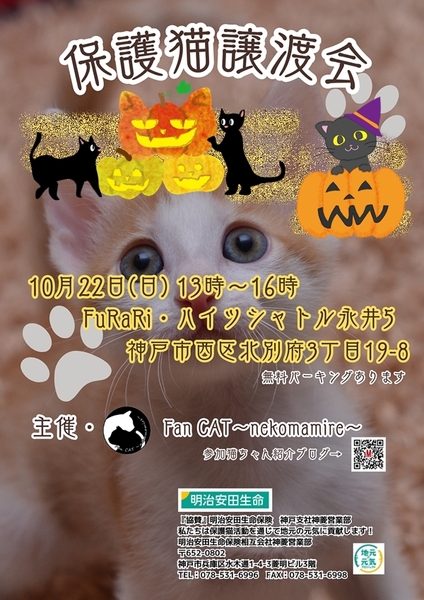 | イベント内容 | 神戸【猫の譲渡会】猫まみれ with FuRaRi 第24回 Fan CAT~nekomamire~です。 10月22日(日)神戸市西区のFuRaRi(ikawadani7)で保護猫の譲渡会を開催します! ペットショップではなく保護猫を迎える選択を。 可愛い子猫たくさん参加予定です。 神戸市西区北別府3丁目19-8 FuRaRi隣、ハイツシャトル永井5の1階のお部屋で13時から16時までの開催 入場無料・無料駐車場有り・室内広々なので待ち時間なしです 棒~ingキッカー・こにゃんこテトラ・猫柄マグネットも販売します。 どうぞよろしくお願いします。 主催・Fan CAT~nekomamire~ https://mycatkobe.blog.fc2.com/ (ブログでは参加猫ちゃん紹介します!) |