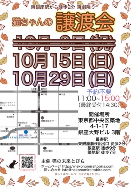 | イベント内容 | 東銀座で保護猫の譲渡会を開催しています「猫の未来とびら」です♪ 恵まれない環境にいる猫たちが未来へのとびらを開いて幸せなご縁に繋がる橋渡しをしていきます。 たくさんの猫ちゃんと保護主・スタッフ一同みなさまのご来場を心よりお待ちしています! 子猫ちゃん〜成猫ちゃんまで参加します♪ ※コロナ対策のマスク着用が緩和され, マスクを着用するかどうかは個人の判断となりましたが、 感染防止対策の上では、マスクは有効な手段です。 当会としましては、従来通りマスク着用をお願いしたいと思います※ 【ご来場いただく皆様には下記についてお願い致します】 ★不織布マスクの着用をお願い致します。 ★譲渡会場にお入り頂く前に手洗いと手の消毒をお願い致します。 ★熱のある方や体調の優れない方は譲渡会への来場を見合わせて頂けますよう、お願い致します。 ★来場者数によりましては人数制限もありますので長時間お待たせてする場合もございます。 予めご了承下さい。 コロナウイルス感染防止の為、大変恐縮ですが何卒ご理解とご協力、ご了承をいただけますようお願い致します。 ★☆★★☆★★☆★★☆★★☆★★☆★★☆★★☆★★☆★ ★開催日時 2023年10月15日(日) 11:00~15:00(最終受付 14:30) ★会場 東京都中央区築地4-1-17 銀座大野ビル 3階 (東劇となり) ★最寄駅 東銀座駅 6番出口 徒歩2分 銀座駅 徒歩9分 ・築地駅 徒歩7分 駐車場は当ビル又は近隣のコインパーキング等をご利用ください。 会場への直接のお問い合わせはご遠慮くださいませ。 ★☆★★☆★★☆★★☆★★☆★★☆★★☆★★☆★★☆★ 会場で猫ちゃんと触れ合ってご縁を繋いでください。 里親様・猫ちゃんが双方、幸せな家族になれるよう保護主・スタッフがサポート致します。 ご不安な事はお気軽にご相談ください。 入場無料です。事前のご予約は不要です。 当日猫ちゃんの引き渡しはございません。 後日、保護主が里親様宅へお届けいたします。 ※参加予定猫ちゃんは、急な体調不良等で不参加になる場合もございます。 開催当日の朝、当会ブログにて不参加の最新情報を掲載致しますのでご確認をお願い申し上げます。 ◇譲渡に関してのお願い・基本条件 1.家族の一員として終生最期まで愛育下さい。 2.完全室内飼い・ペット可のお住まい(契約書を拝見致します) 3.脱走防止対策 4.避妊・去勢手術 5.里親様のご自宅へのお届け 6.譲渡誓約書への署名捺印・身分証明書の提示 7.医療費譲渡金のご負担 8.定期報告 9.トライアル期間有り ※保護主により譲渡条件は異なりますので会場で直接ご相談ください。 60才以上の方のみのご家庭、未成年の方、単身の方、同棲中の方、 小学生低学年以下のお子様のいる方、必要な脱走対策を施していただけない方は譲渡をご遠慮頂く場合もございますのでご了承ください。 仔猫の場合は主にお世話される方のご年齢は55歳までとさせて頂きます。 オーバーする方はご相談くださいませ。 小さな子猫の譲渡は体重が1kgになってからのお届けやお留守番の無い(少ない)ご家庭を希望いたします。 医療費譲渡金に関しましては詳しくはホームページの 【譲渡に関してのお願い】【譲渡の流れ】をご覧くださいませ。 ~主催 猫の未来とびら~ |