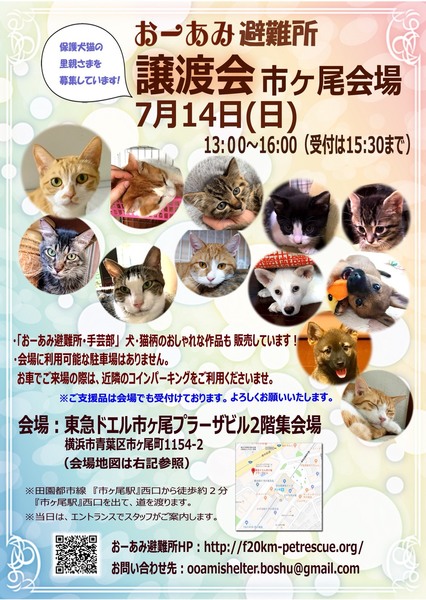 | イベント内容 | 可愛い仔犬・仔猫・成猫がたくさん、出場しますよ! 当日にはご来場できないかたも、ぜひお問い合わせください。 別日にお見合いの設定も可能です。 どうぞ、よろしくお願いします。 ☆★☆★☆★☆★☆★☆★☆★☆★☆★☆★☆★☆★☆★☆★☆★☆★☆★☆★☆ ~7月14日(日)市ヶ尾にて里親会開催!~ ◎場所・・「東急ドエル市ヶ尾プラーザビル2階集会場」 横浜市青葉区市ヶ尾町1154-2 東急田園都市線「市ヶ尾」駅より徒歩2分 ◎日程・・7月14日(日)(雨天決行) ◎時間・・13時から16時(受付は15時30分まで) (駐車場はございません。お車でお越しの際は近隣のコインパーキングをご利用ください) ■当日ご来場の方全員にアンケートを記入して頂きます。 ■下記リンクより事前にアンケートをご記入いただくと、待ち時間が短縮されます。 ★ 猫ご希望のかた向けアンケート https://goo.gl/ZNRFtI ★ 犬ご希望のかた向けアンケート https://goo.gl/pwWUMj ■アンケートで頂戴した個人情報は適切に管理し、里親さま決定のための資料としてのみ使用いたします。 ■アンケートをご提出いただいても、譲渡をお約束するものではないことをご承知置きください。 ※参加予定の猫は体調により参加できない場合があります。ご了承ください。 ※詳細はお問い合わせいただくか、ブログ・HPをご覧くださいませ。 おーあみ避難所ブログ:http://ameblo.jp/oami-hinanjyo おーあみ避難所HP:http://www.geocities.jp/oami_hinanjyo/ ☆★☆★☆★☆★☆★☆★☆★☆★☆★☆★☆★☆★☆★☆★☆★☆★☆★☆★☆ |