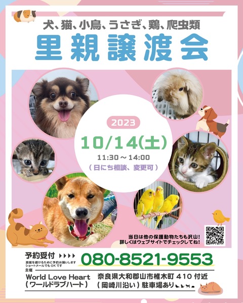 | イベント内容 | ワールドラブハートで里親募集中の動物たちの譲渡会を開催します! 犬猫だけではなく、インコやラット、ウサギにモルモットなどたくさんの保護動物がいます! みんな新しい家族を探しています。写真だけでは伝えきれない魅力が盛りだくさん! 実際に会ってそのかわいさを実感してください♪ ★里親募集中の動物たち★ https://satoya-boshu.net/foster/?@button_name@=search&FosterParent_MemberID=1161 ・犬、猫 ・ウサギ ・モルモット ・インコ ・キンカチョウ ・ウコッケイ ・ヘビ ・カメ ……など 子犬や子猫もたくさんいますよ♡ ぜひお気軽にお越しください! ●混雑をさけるために、事前予約をお願いします。 予約番号080-8521-9553 ショートメールでも可♪ ●当日までに譲渡が決定した・体調がすぐれないなど、やむを得ない理由で不参加の場合があります。ご希望の子がいましたら、当日お問い合わせください。 ●当日、その場での引き渡しはしておりません。譲渡決定後、自宅訪問を兼ねてこちらからお届け致します。 ご来場お待ちしております♪ ★world love heart(ワールドラブハート)は、奈良県大和郡山市で活動している動物保護団体です。 『引き取り依頼は断らない』をモットーに、犬、猫、鶏、小動物、家畜、爬虫類など捨てられた動物を保護しています。 https://worldloveheart-nara.jimdofree.com |