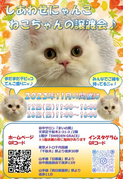 | イベント内容 | 「しあわせにゃんこ」は行き場のない猫ちゃんと里親様との 出逢いの場を提供するグループです♪ 子猫も成猫もハンデのある猫もみんな新しい家族を待っています♪ みなさまのご来場を保護主、スタッフ一同心よりお待ちしております♪ 詳しくはホームページ譲渡会情報をご確認願います。 http://www.shiawasenyanko.net 秋の深まりを感じる今日この頃♪ にゃんこの温もりがありがたい季節になってきましたね♪ ご縁を待っているにゃんこと皆様のご来場をお待ちしております♪ ◆開催日/開催時間◆ 2023年11月12日(日) 11:00~16:00 ご希望の猫ちゃんがいらっしゃる場合は11時30分までに受付をお願い致します。 複数のお申し込みがある場合は11時30分で受付を終了させて頂く場合がございます。 受付をされた全ての里親様とお見合いをさせて頂きます。 ※先着順ではございません。 ※当日、猫ちゃんを連れて帰ることは出来ません。 後日調整のうえ保護主が里親様宅へお届けいたします。 ◆会場◆ 受付はまいの間1階です♪ ※お店の奥に会場への階段がございます♪ 譲渡会場:東京都文京区千駄木2-31-3 1階が北欧雑貨ショップ「SWEDENGRACE」 2階が谷中サロン「まいの間」 ※詳しいアクセスはホームページをご覧下さい http://www.shiawasenyanko.net 谷中サロン「まいの間」の情報はこちら http://neko-to-kyo.com/#maima ◆交通手段◆ 東京メトロ千代田線「千駄木」駅より徒30秒 JR山手線「西日暮里」駅より徒歩11分 JR山手線「日暮里」駅より谷中銀座経由で徒歩13分 ※お車でご来場の際、駐車場のご用意はございません。 近隣のコインパーキング等をご利用ください。※近隣に沢山あります。 いつ里の掲載参加猫一覧はこちらから https://satoya-boshu.net/mypage/foster_list.php?@ps@=none アメーバブログの里親募集にゃんこはこちら https://ameblo.jp/shiawasenyan-ko/theme-10092719565.html ◆猫ちゃんとのお見合い◆ 掲載している猫ちゃんは基本的に譲渡会場でのお見合いのみとなります。 譲渡会への参加が決定している猫ちゃんはその譲渡会で里親様が決定しなかった場合のみ保護主宅でのお見合いが可能となります。 自宅お見合いを希望される里親様はメール(info@shiawasenyanko.net)にてご相談ください。 ◆当譲渡会では猫ちゃんと里親様のスキンシップを大切にしています◆ 新しい家族として20年以上いっしょに暮らしていく猫ちゃんです。 譲渡会場でたくさんの猫ちゃんと触れ合って良きパートナーを見つけてください。 はじめて猫ちゃんを迎える不安や先住猫ちゃんとのトライアルの注意点、猫ちゃんと里親様の暮らし方など気軽にご相談ください。 経験豊富な保護主や猫大好きスタッフがアドバイスさせていただきます。 ◆子猫ご希望の里親様◆ 子猫は急な下痢や発熱等により体調が急変し、数時間対応ができなかっただけでも命を落とす事があります。 その為、当譲渡会では月齢によりお留守番のない又は少ないご家庭への譲渡に限らせて頂いております。 また里親様と子猫ちゃんが安心してトライアル期間を過ごせるよう体重が1㎏程になってからのお届けとさせて頂いております。 ◆里親希望のみなさまへ◆ ご家族の皆様で生涯、家族の一員としてたっぷり愛情を注いでくださるご家庭をお待ちしております。 下記に該当する希望者様へ ・独身、単身者の方 ・友人同士、同棲でのお住まいの方 ・高齢者のみのご家庭の方 は、ご相談の上、譲渡を判断させて頂きます ・適正飼育の不可能な方 ・脱走防止対策を考えて頂けない方 ・定期報告の不可能な方 は、ご遠慮下さいますようお願い致します ◆ご負担頂く費用について◆ 譲渡の際に譲渡負担金(医療費の一部、譲渡金、お届け時の交通費)を里親様にご負担頂く事により 過酷な状況にいる猫ちゃんを保護し新しいご家族の元へ送り出す事ができています。 皆様のご理解とご協力にボランティア一同、心より感謝しております。 ご負担頂く医療費につきましてはホームページに詳しく記載させて頂いております。 http://www.shiawasenyanko.net/onegai.html しあわせにゃんこホームページ http://www.shiawasenyanko.net メールでのお問い合わせ info@shiawasenyanko.net |