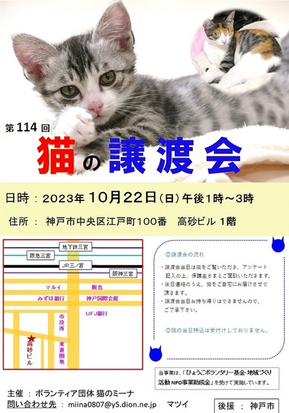 | イベント内容 | 大人猫も仔猫も参加の譲渡会です。 猫たちが幸せになるために、新しいお家を求めて参加します(=^・^=) 猫は後日こちらからお届けをさせて頂き、お家の環境を見せて頂ければと思います。 仔猫は20年くらい生きる子もいますので、ご自身の年齢に合った猫さんとの出会いを探しに来てください。 ペット不可にお住まいの方はご遠慮ください!(ご確認してください。) 譲渡には条件が多数ありますので、ご理解くださいませ<m(__)m>。 まずはお試しで猫との相性を見てから、正式譲渡となります。 また、猫を保護して里親を探そうと思われている方も、〖参加猫の募集〗をしていますので、お申し込みくださいね! アドレス miina0807@y5.dion.ne.jp にご連絡をください。 お越しの際は各路線の三宮駅からは徒歩10分くらい、車でお越しの場合は近隣のコインパーキングなどにお停めください。 当日、体調の悪い方、発熱がある方、このような方はご遠慮ください。 定例の毎月は第2日曜日に譲渡会を開催しておりますので、次回の出会いに期待をしてくださいね。 ブログ: 猫のミーナといっしょ http://miina300.blog.fc2.com/ ねこのオカン https://ameblo.jp/miina300/ |