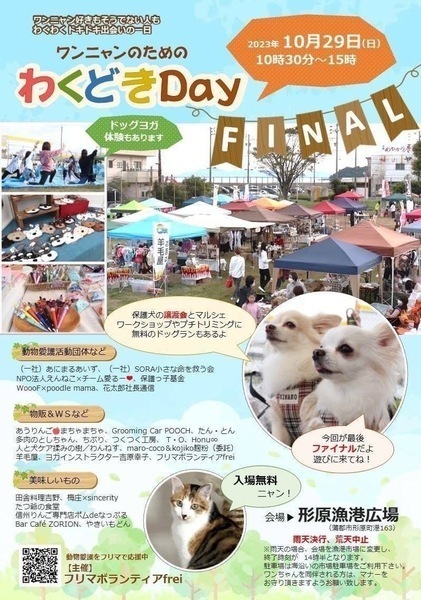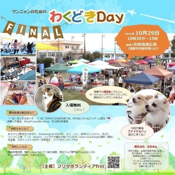 | イベント内容 | 愛知県の一般社団法人SORA小さな命を救う会です。 保護犬のお見合い会やマルシェでのフリーマーケットに参加致します。 ぜひ、可愛い保護っ子達に会いに来て下さいね。 フリーマーケットの収益は、全て保護犬の医療など保護活動使わせていただきます。 事前のお申込みは不要です。保護活動ブログで、開催日の数日前に譲渡会参加が決定したワンコたちのご案内もしておりますので、ご希望のワンコの参加をご確認してお越し頂けますと幸いです。 開催日時 2023年10月29日(日) 開催時間 10:30~15:00 会場 形原漁港広場 (蒲郡市形原町港町163) SORA公式ホームページ https://sora-chiisana.org/foster/ SORA公式活動メインブログ https://ameblo.jp/sora-chiisana-inochi/ SORAイベントブログ https://ameblo.jp/sora-charity-events/ |