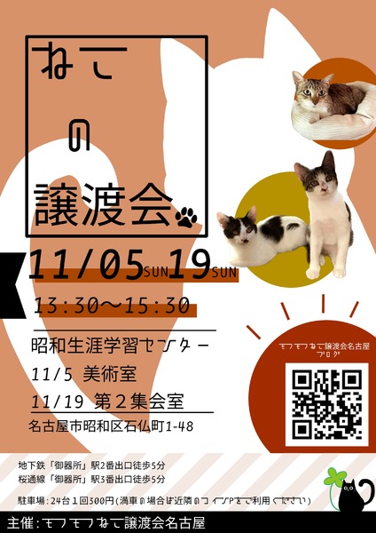 | イベント内容 | モフモフねこ譲渡会名古屋 猫たちの幸せなお家探しのために譲渡会を開催しております。 個人ボランティアの集まりです。 自分たちの出来ることから頑張っております! 一匹でも幸せになれる猫が増えますように 場所 昭和生涯学習センター 第2集会室 住所 名古屋市昭和区石仏町1-48 時間 13時30分~15時30分 交通機関等 地下鉄「御器所」鶴舞線2番出口南約300m 桜通線3番出口南東約300m 駐車場24台(満車の場合は近隣コインPをご利用ください) 参加猫の情報は下記モフモフねこ譲渡会名古屋ブログにてご確認ください。 https://mofumofuneko4.fc2.net/ 【譲渡会について】 ・譲渡会は入場無料、予約不要です。お気軽にご参加ください。 ・会場へのお問い合わせはご遠慮ください。 ご質問は下記メールアドレスへお願いいたします。 mofumofuneko4☆gmail.com ☆を@に変更してお問い合わせください。 ・猫の引き取りはしておりません。 ・譲渡会当日に猫をお渡しすることはありません。 ・保護主によって譲渡条件が違う場合があります。 ・参加予定でも譲渡会前にトライアルになる場合があります。 ご希望の猫がいましたらまずはお問い合わせをお願いいたします。 【参加猫について】 ・ノミ駆除、駆虫、トイレ躾、ワクチン3種接種済。 ・年齢や健康状態に応じて、避妊手術を行っております。 ・参加予定で紹介していても当日体調不良等で欠席になる場合があります。 【譲渡の約束事】 ・ペット飼育可の住宅にお住まいの方。 ・完全室内飼育。 ・脱走防止の対策をしていただける方。 ・避妊手術未実施の場合、避妊手術 の実施と報告をしていただける方。 ・ご家族全員が猫を飼うことに同意していること。 ・譲渡後、しばらく定期連絡を入れていただける方。 *お一人暮らしの方、60歳以上の方は、身内の方の保証が必要となる場合がございます。 #名古屋昭和区 #昭和生涯学習センター #譲渡会 #保護猫 #地域猫 #さくらねこ #tnr #里親募集 #里親募集中 #猫 #ねこ #殺処分ゼロ #買わずに飼おう #モフモフねこ譲渡会名古屋 #ペットショップに行く前に #譲渡会のお知らせ #猫と暮らしたい |