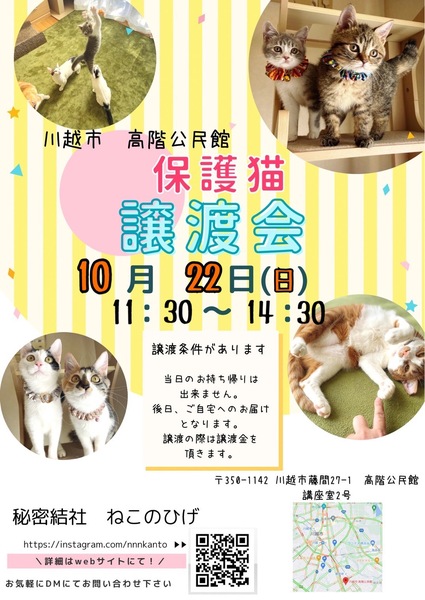 | イベント内容 | 【秘密結社ねこのひげ♡保護猫譲渡会】 10/22(日) 11:30~14:30 川越市藤間27-1 高階公民館 講座室2号内 にて開催します☆ すくすくと成長している 安心な月齢(4~6ヶ月)な仔猫たちが25頭ほどと♪ 5才までは子猫だにゃー!なヤング猫や まだまだ若いもんにゃ負けないにゃー!な 完成されたモフモフなオトナ猫たちも 数頭ワクテカで参加します♪ 未来のご家族さまと 愛し愛されな 両想いになれますように♡ 家族にするなら保護猫だべ♪♪ こんなご時世だけど 新しい家族と笑顔で暮らしたい♪ という方は是非会いにいらしてください♡ ご不明な点がございましたら インスタグラム @秘密結社ねこのひげ の DMまでお問い合わせ下さい。 |