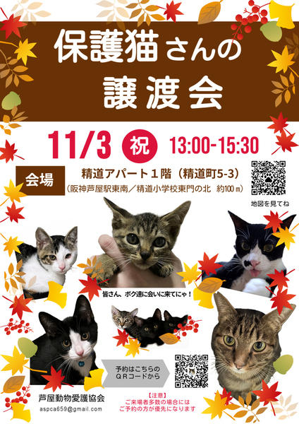 | イベント内容 | 芦屋動物愛護協会は、兵庫県芦屋市で活動している動物愛護団体で、70年という古い歴史を持っています。(1953年設立) 会員数は約200名。現在のおもな活動は、野良猫さんのTNR活動と保護動物(主に犬と猫)の譲渡を行なっています。 活動資金は、年に2回開催するバザー(持ち寄った不用品を販売)による収益と寄付金で賄っています。今回は、いつもバザーの時にお借りしているお馴染みの会場で、保護猫の譲渡会を行なうことになりました。 色々なタイプの猫ちゃんがエントリー予定です。 どうぞお気軽に猫ちゃん達に会いにいらしてください。沢山の方のご来場をスタッフ一同お待ちしております。 |
