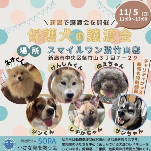 | イベント内容 | 新潟県で保護犬の譲渡会を開催致します。 ぜひ可愛い保護っ子達に会いに来て下さいね。 チャリティーグッズの収益は、全て保護犬の医療など保護活動使わせていただきます。 事前のお申込みは不要です。保護活動ブログで、開催日の数日前に譲渡会参加が決定したワンコたちのご案内もしておりますので、ご希望のワンコの参加をご確認してお越し頂けますと幸いです。 なお、新型コロナウィルス感染拡大の状況におきまして、中止させていただくこともございますのでご了承下さい。 SORA公式ホームページ https://sora-chiisana.org/foster/ SORA公式活動メインブログ https://ameblo.jp/sora-chiisana-inochi/ SORAイベントブログ https://ameblo.jp/sora-charity-events/ |