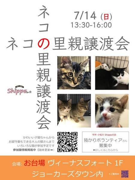 | イベント内容 | 猫の里親譲渡会ヴィーナスフォートで開催! ヴィーナスフォート内の会場をお借りして里親譲渡会を開催いたします。 工場や民家から保護した子、遺棄されたところを保護した子、親子で保護した猫さん等々、かわいい子猫ちゃんからお留守番もできる大人の猫さんまで、いろいろな猫さんが参加予定です。 また、預かっていただいているお宅で、絶賛里親募集中の猫さんたちも、会場内のポスター等で紹介予定です。 猫の里親さんになりたい方、保護猫に興味のある方、皆さま、ぜひ足をお運びください! ●日時:7月14日(日)13:30~16:00 ●会場:ヴィーナスフォート 1Fジョーカーズタウン内 東京都江東区青海1-3-15 下記店内マップをご参照ください。 https://www.venusfort.co.jp/floormap/1f.html ●アクセス ゆりかもめ「青海駅」徒歩6分 りんかい線「東京テレポート駅」徒歩10分 ●当日はネコグッズ他チャリティグッズ販売、保護猫パネル展示も予定しております。 譲渡には当会における一定の条件があります。 参加猫および諸条件については、下記「ペットのおうち」からご覧ください(随時更新予定)。 https://www.pet-home.jp/member/user360938/post/ 当会および里親譲渡会についてのお問い合わせ hilakoma@yahoo.co.jp 当会のブログ(ひらこましっぽ検索でも出てきます) https://ameblo.jp/hirakomashippo/ ☆平井・小松川Shippoの会は、江戸川区の平井小松川地域をメインに活動しています。 ☆外猫、保護猫のために物資のご支援を頂ける方がおりましたら、送付先をご連絡させていただきますのでご連絡下さい。 ☆預かりボランティアさん、活動のお手伝いをして頂ける方も随時募集中です。 hilakoma@yahoo.co.jp |
