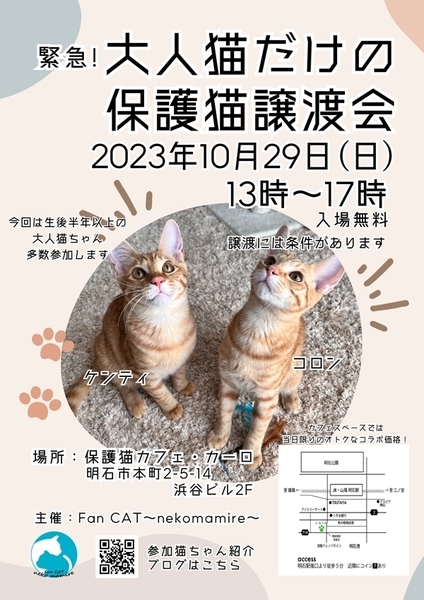 | イベント内容 | 大人猫だけの譲渡会 in 明石市 日時 10月29日(日)13時から17時まで(譲渡会参加は無料です) 場所:明石市本町2-5-14 浜谷ビル2階 保護猫カフェ・カーロ 事務所側 (譲渡会のお問合せはカーロさんにしないようにお願いします) Pは近くにコインパーキングがたくさんありますのでご利用お願いします 少し子猫より大きくなったまだあどけない5か月から 落ち着いた大人猫までが参加しています 参加猫さんの紹介をしていますのでブログにてご確認ください 本気で猫を飼いたい方是非ご来場ください 早い順ではございませんが早くに決まってしまう場合がございますので お早めにお越しいただくか面会予約をお願いします ※猫の譲渡は無料ではありません(譲渡会参加は無料です) ※当日連れて帰れません ※譲渡条件があります ●参加猫たちのお紹介やお問い合わせ(面会予約等)は ブログまたはInstagramDMよりご連絡お願いします https://mycatkobe.blog.fc2.com/ 主催:Fan CAT~nekomamire~ |