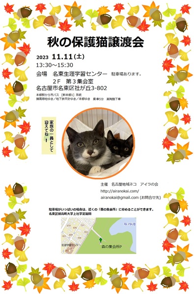 | イベント内容 | 名東生涯学習センター2F第三集会室で里親会を開催します。 地域で、住民の方たちと協力して去勢不妊手術した親猫が生んだ仔猫たちがメインの里親会になります。 大人猫も参加します。 責任をもって完全室内飼いで飼っていただける方にお譲りします。 10匹ほどのねこたちが参加する予定です。 生涯学習センターの駐車場がいっぱいの時は、「森の集会所」の駐車場をご利用ください。 会場から徒歩3分ほどの場所にあります。 http://airanokai.com お問合せ airanokai@gmail.com |