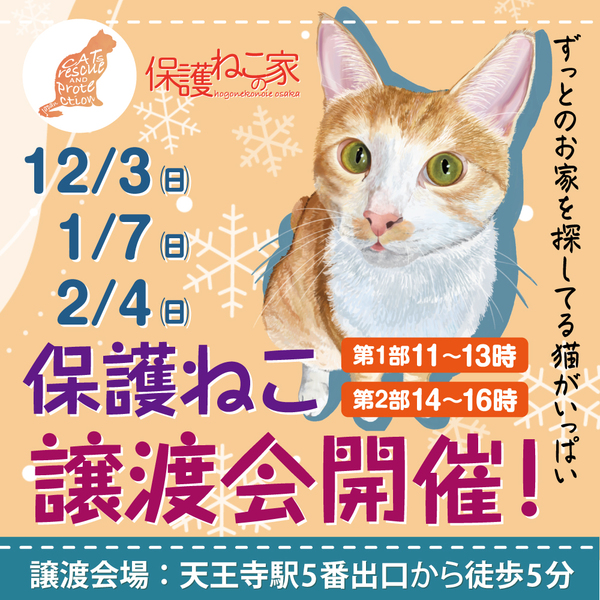| イベント内容 | 毎月第1日曜の11時~13時と14時~16時の2部制にて「保護ねこの家 譲渡会」を開催しています。 会場は、天王寺駅から徒歩5分。 会場横には、コインパーキングもあります。 また、同日同時刻に「保護ねこの家 オンライン譲渡会」も開催しています。 子猫から大人猫までたくさんの保護猫たちが参加します。 是非、会場まで足をお運びください。 ------------ 【 日時 】 毎月第1日曜 第1部:11時~13時 第2部:14時~16時 ※1部と2部では参加猫が異なります 【 会場 】 Bear's Kitchen 大阪市阿倍野区旭町1丁目1-22 山本ビル1F 【 アクセス 】 大阪メトロ 天王寺駅 5番出口 西へ徒歩5分 会場横にコインパーキングあり ▾アクセス動画▾ https://youtu.be/fx1OtVDPgl4 【 参加条件 】 参加費は無料となります 予約や事前エントリーなどは不要です 未成年者のみ・高齢者のみのご来場はご遠慮ください 【 参加猫 】 当会SNSにて開催7日前より順次案内いたします ▾Instagram▾ https://www.instagram.com/hogonekonoie_st/ ▾X(Twitter)▾ https://twitter.com/hogonekonoie_st ▾ブログ▾ https://ameblo.jp/hogonekonoie/theme-10113553723.html/ 【 詳細情報やお問合せ 】 当会Webサイトをご確認ください ▾保護ねこの家 Webサイト▾ https://www.hogonekonoie.jp/jotokai/ ------------ |