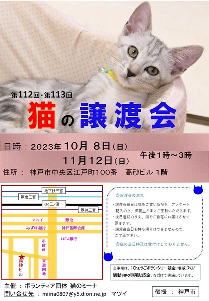 | イベント内容 | 今回も可愛い猫たちが参加する譲渡会です。 猫たちが幸せになるために、新しいお家を求めて参加します(=^・^=) 猫は後日こちらからお届けをさせて頂き、お家の環境を見せて頂ければと思います。 仔猫は20年くらい生きる子もいますので、ご自身の年齢に合った猫さんとの出会いを探しに来てください。 ペット不可にお住まいの方はご遠慮ください!(ご確認してください。) 譲渡には条件が多数ありますので、ご理解くださいませ<m(__)m>。 まずはお試しで猫との相性を見てから、正式譲渡となります。 また、猫を保護して里親を探そうと思われている方も、〖参加猫の募集〗をしていますので、お申し込みくださいね! アドレス miina0807@y5.dion.ne.jp にご連絡をください。 お越しの際は各路線の三宮駅からは徒歩10分くらい、車でお越しの場合は近隣のコインパーキングなどにお停めください。 当日、体調の悪い方、発熱がある方、このような方はご遠慮ください。 定例の毎月は第2日曜日に譲渡会を開催しておりますので、次回の出会いに期待をしてくださいね。 ブログ: 猫のミーナといっしょ http://miina300.blog.fc2.com/ ねこのオカン https://ameblo.jp/miina300/ |