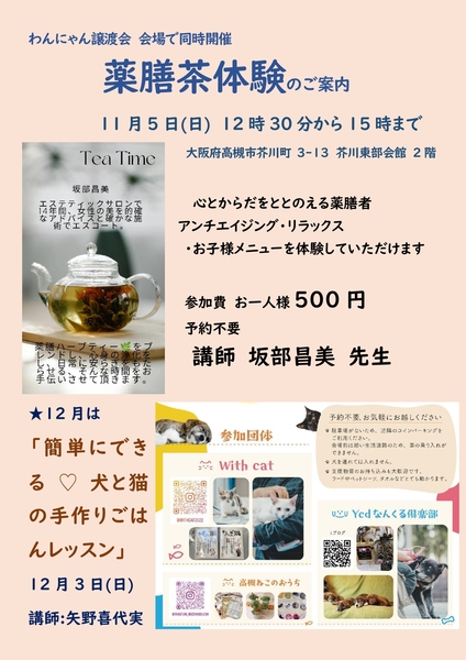 | イベント内容 | 高槻ねこのおうち・With cat・Ycdなんくる倶楽部 共催で、合同譲渡会とチャリティグッズ販売イベントを開催します。 会場 大阪府高槻市芥川町3-13 芥川東部会館 時間 11時〜15時 毎回、猫は子猫からおとな猫までたくさん参加。今回は2~3か月齢の子猫を中心に20頭ほどの猫が参加。 子猫から飼いたいかたは是非ご来場ください。 犬の部は、今回は写真パネル参加となります ★12時半から「薬膳茶体験」イベントがあります。 参加費500円で、どなたでも3種類の薬膳茶を体験していただけます ★犬・猫とも、飼育用品のご提供大歓迎です。物価高騰で苦戦しております。 フード、トイレシート(ワイドサイズ)等の消耗品、ご不用のケージ等、掃除に使う古タオル…受付までお持ちください。 新品でなくても、サイズが合わなくなった、買ってみたけどあまり使わなかったという飼育用品ありましたら、捨てる前に是非お持ちください チャリティーグッズ販売もあります。 会場 大阪府高槻市芥川町3-13 芥川東部会館 時間 11時〜15時 駐車場はありませんので、近隣のコインパーキングをご利用ください。 予約不要。犬は連れて入れません。 里親さん決定は先着順ではありません。 |