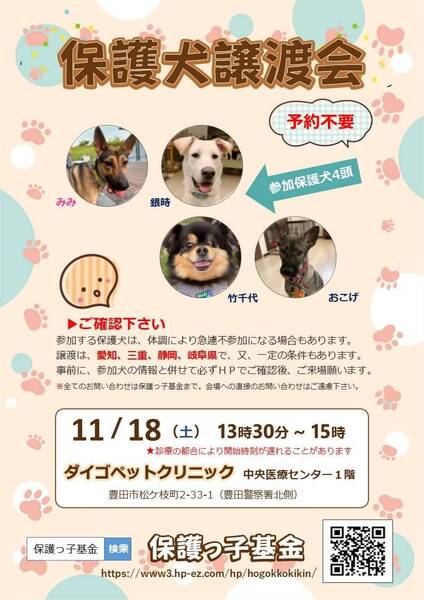 | イベント内容 | 保護犬の譲渡会です。 予約は不要。 参加犬は 曜日で違います。必ずHPでご確認下さい ※[ 保護っ子基金 ] で 必ず検索してみてください!! http://www3.hp-ez.com/hp/hogokkokikin ・保護っ子基金 代表ブログ → https://ameblo.jp/kazuyo160/ 豊田市にて 室内の 保護犬の譲渡会です。 予約は不要です。 ・当日 犬を連れて帰ることはありません。 ※[ 保護っ子基金 ] で 必ずホームページを検索して 条件などを 確認のうえ、ご来場願います。 http://www3.hp-ez.com/hp/hogokkokikin 現在は4匹の犬が 参加予定でございます。 犬の毎日の様子は 各 預かりのブログなどを ご確認ください。 また他にも ご不明な点が ございましたらホームページから ご質問ください。 |