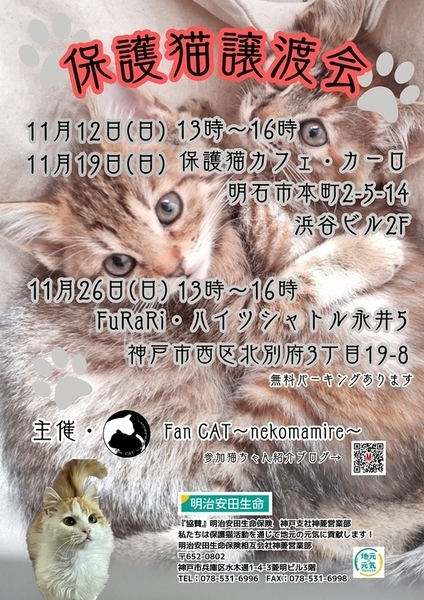 | イベント内容 | 猫の譲渡会 日時:11月19日(日)13時から16時まで(譲渡会参加は無料です) 場所:明石市本町2-5-14 浜谷ビル2階 保護猫カフェ・カーロ (お問合せはカーロさんにしないようにお願いします) ★お車の方は近隣にコインパーキングがたくさんありますので ご駐車お願いします 子猫ちゃんがたくさん参加しています♪ 本気で猫を飼いたい方是非ご来場ください♫ 早い順ではございませんが早くに決まってしまう場合がございますので お早めにお越しいただくか面会予約をお願いします ※猫の譲渡は無料ではありません(譲渡会参加は無料です) ※当日連れて帰れません ※譲渡条件があります ●参加猫たちのお紹介やお問い合わせ(面会予約等)は ブログよりご連絡お願いします ご紹介は譲渡会の1週間前くらいから始まります https://ameblo.jp/wan--love--nyan/ 主催:ハピニャン |