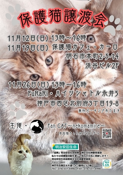 | イベント内容 | 猫の譲渡会 2023年11月26日(日)13時~16時 神戸市西区北別府3丁目19-8 Fu・Ra・Ri(igawadani7 ハイツシャトル永井5) https://goo.gl/maps/Cq15cEHSiWqmYVC8A Fu・Ra・Ri(ikawadani7)無料パーキングあります 子猫ちゃんも参加しています! 中猫さん大人猫も参加していますので是非ご参加ください!! 参加の猫ちゃんたちはブログにて譲渡会1週間前から掲載しています https://mycatkobe.blog.fc2.com/ お見合いしたいと思われる方は、ブログのメールフォーム、InstagramのDMより お越しになる時間をご連絡ください ※譲渡は無料ではございません(譲渡会参加は無料です) ※譲渡条件がございます ※当日連れて帰れません ※※早い順ではございませんがご縁があれば早くに決まってしまう 場合がありますのでお見合いの予約かお早めにご来場ください 主催 Fan CAT~nekomamire~ |