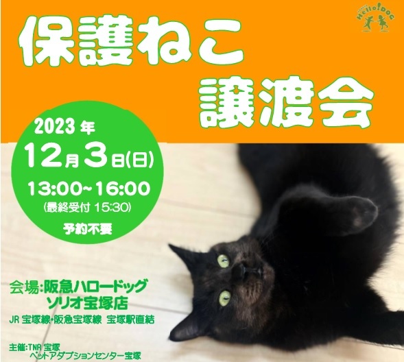| イベント内容 | 保護ねこ譲渡会 at 阪急ハロードッグ宝塚 https://ameblo.jp/takarazuka-tnr/ 様々な理由で行き場を失った猫たちが、皆様のお越しをお待ちしています。 会場内では、猫たちと直接触れ合って頂けます。 【日時】 2023年12月3日(日) 13:00~16:00(最終受付15:30) 【場所】 阪急ハロードッグ・ソリオ宝塚店内 阪急宝塚駅直結 ・ JR宝塚駅 徒歩2分 兵庫県宝塚市栄町1-1 ソリオ宝塚Ⅰ-1F 【予約不要】 直接会場へお越し下さい。 【ご注意事項】 必ずご一読下さい。 ※ 譲渡は先着順ではありません! すべての方の見学が終わってから 猫達にいちばん合う里親様を決定させて頂きます。 ※13時~14時はかなり込み合います。先着順ではないので時間をずらして来場下さい。 【主催】 特定非営利活動法人 TNR宝塚 【協力】 阪急ハロードッグ ソリオ宝塚店/ペットアダプションセンター宝塚 【後援】 宝塚市 |