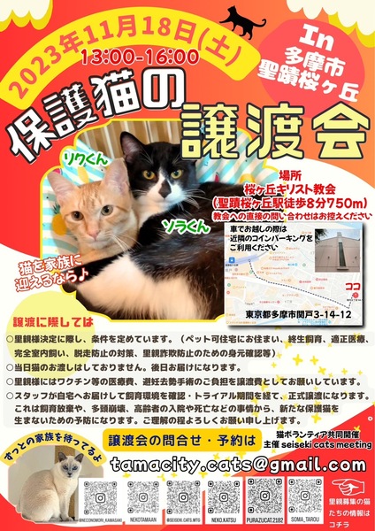 | イベント内容 | ◇保護猫の譲渡会◇in東京都多摩市◇ 子猫から12歳までの保護猫が 多数参加予定です。 参加猫の詳細はInstagram又はブログをご覧下さい。 https://instagram.com/nekotamaan https://blog.goo.ne.jp/nekotamaan/e/a8c3101442238bbec8ce52e5776122b6 【日時】11月18日(土) 13:00〜16:00 【場所】桜ヶ丘キリスト教会 多摩市関戸3-14-12 (聖蹟桜ヶ丘駅徒歩8分) ※車でお越しの際は近隣のコインパーキングをご利用下さい。 【ご予約お問い合わせ】tamacity.cats@gmail.com 完全予約制ではございませんが ご予約の方優先でご案内させていただきます。 予約の際はお時間指定していただけると助かります。 |