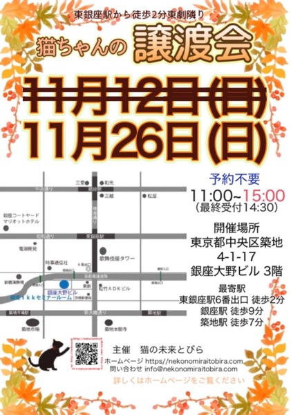 | イベント内容 | 東銀座で保護猫の譲渡会を開催しています「猫の未来とびら」です♪ 恵まれない環境にいる猫たちが未来へのとびらを開いて幸せなご縁に繋がる橋渡しをしていきます。 たくさんの猫ちゃんと保護主・スタッフ一同みなさまのご来場を心よりお待ちしています! 子猫ちゃん〜成猫ちゃんまで参加します♪ ※コロナ対策のマスク着用が緩和され, マスクを着用するかどうかは個人の判断となりましたが、 感染防止対策の上では、マスクは有効な手段です。 当会としましては、従来通りマスク着用をお願いしたいと思います※ 【ご来場いただく皆様には下記についてお願い致します】 ★不織布マスクの着用をお願い致します。 ★譲渡会場にお入り頂く前に手洗いと手の消毒をお願い致します。 ★熱のある方や体調の優れない方は譲渡会への来場を見合わせて頂けますよう、お願い致します。 ★来場者数によりましては人数制限もありますので長時間お待たせてする場合もございます。 予めご了承下さい。 コロナウイルス感染防止の為、大変恐縮ですが何卒ご理解とご協力、ご了承をいただけますようお願い致します。 ★☆★★☆★★☆★★☆★★☆★★☆★★☆★★☆★★☆★ ★開催日時 2023年11月26日(日) 11:00~15:00(最終受付 14:30) ★会場 東京都中央区築地4-1-17 銀座大野ビル 3階 (東劇となり) ★最寄駅 東銀座駅 6番出口 徒歩2分 銀座駅 徒歩9分 ・築地駅 徒歩7分 駐車場は当ビル又は近隣のコインパーキング等をご利用ください。 会場への直接のお問い合わせはご遠慮くださいませ。 ★☆★★☆★★☆★★☆★★☆★★☆★★☆★★☆★★☆★ 会場で猫ちゃんと触れ合ってご縁を繋いでください。 里親様・猫ちゃんが双方、幸せな家族になれるよう保護主・スタッフがサポート致します。 ご不安な事はお気軽にご相談ください。 入場無料です。事前のご予約は不要です。 当日猫ちゃんの引き渡しはございません。 後日、保護主が里親様宅へお届けいたします。 ※参加予定猫ちゃんは、急な体調不良等で不参加になる場合もございます。 開催当日の朝、当会ブログにて不参加の最新情報を掲載致しますのでご確認をお願い申し上げます。 ◇譲渡に関してのお願い・基本条件 1.家族の一員として終生最期まで愛育下さい。 2.完全室内飼い・ペット可のお住まい(契約書を拝見致します) 3.脱走防止対策 4.避妊・去勢手術 5.里親様のご自宅へのお届け 6.譲渡誓約書への署名捺印・身分証明書の提示 7.医療費譲渡金のご負担 8.定期報告 9.トライアル期間有り ※保護主により譲渡条件は異なりますので会場で直接ご相談ください。 60才以上の方のみのご家庭、未成年の方、単身の方、同棲中の方、 小学生低学年以下のお子様のいる方、必要な脱走対策を施していただけない方は譲渡をご遠慮頂く場合もございますのでご了承ください。 仔猫の場合は主にお世話される方のご年齢は55歳までとさせて頂きます。 オーバーする方はご相談くださいませ。 小さな子猫の譲渡は体重が1kgになってからのお届けやお留守番の無い(少ない)ご家庭を希望いたします。 医療費譲渡金に関しましては詳しくはホームページの 【譲渡に関してのお願い】【譲渡の流れ】をご覧くださいませ。 ~主催 猫の未来とびら~ |