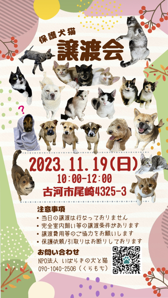 | イベント内容 | いばらきの犬と猫 譲渡会を行います✳︎ 可愛い保護犬猫を家族に迎えてみませんか? 予約不要/雨天決行/駐車スペース有 (開催場所が分かりにくいので下記の連絡先までご連絡頂ければご案内致します) ※譲渡条件などありますので当会の里親募集ページやHPをご確認ください※ 【不要になったフード(未開封).タオル.ペットシート.新聞紙などありましたら、ご寄付いただけると助かります】 お待ちしております☻♪ 【ボランティアのInstagram】 https://instagram.com/minna_ikiteiru?igshid=OGQ5ZDc2ODk2ZA%3D%3D&utm_source=qr ⚫︎お問合せ⚫︎ 電話▷090-1040-2506 (クラモチ) LINE ID▷ 717217 (モトハシ) |