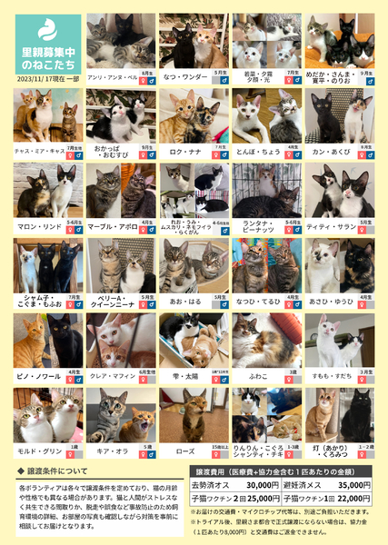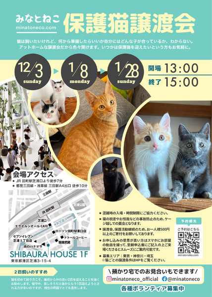 | イベント内容 | みなとねこが毎月定期開催している譲渡会です 2022年は譲渡会を通じて270匹もの猫と里親さんのご縁を繋ぐことができました 譲渡会にはご来場予約が必要です ご予約はみなとねこのHPよりお願いします https://www.minatoneco.com/event 参加猫の詳細はこちら https://www.minatoneco.com/gallery 参加猫たちの様子はYoutubeのみなとねこチャンネルもご覧ください https://youtube.com/playlist?list=PLRxhCqU-Dt77IaUtZCDeratPPI7Jek6ZL ーーー 会場は明るく開放的な雰囲気です Youtube「みなとねこ譲渡会に行ってみよう」 https://youtu.be/8Q4Gti1swQk 30ケージ 60匹ほどの参加となりますが、それ以外の預かり宅の猫もご紹介可能です 子猫は2匹ペアでの譲渡が原則です 初めての方こそ最初から2匹をお勧めしています また私たちボランティアは、ご縁のあった猫たちに終生里親様に愛されて幸せに安全に暮らして欲しいと願っています このため里親になっていただくにはいくつかの条件やお約束事があります。 ◆基本条件(猫それぞれ、保護主により異なります) ・ご家族全員が飼育に賛成であること ・ペット可物件での完全室内飼い、エアコンなどによる室温管理、医師の指示に従い定期的な受診やワクチン接種、 適切な時期(生後4ヶ月中)での避妊去勢、病気予防に配慮したフードの選択、終生飼養をお願いしております。 ・ケージのみの飼育、リビング以外の一室のみでの飼育は不可です。十分な運動のスペースと窓から景色が眺められのんびり日向ぼっこが可能な環境が望ましいと考えています。 ・誤食などの事故防止のため、お部屋の整理整頓や脱走防止にも万全の対策をお願いします。 ・換気が十分でない室内での喫煙をされる方はお断りしております。 ・日々のお世話だけでなく、スキンシップが可能な精神的・時間的・経済的な余裕がある方に限らせていただきます。猫が20年以上生きる中でなるべく変わらぬ環境で愛情を注いで頂けるよう、家族構成やお仕事、お住まいに変化のない方を優先させていただきます。 またお届けやフォローの都合上、募集エリアも東京、神奈川、埼玉に限らせていただいております。 ■里親申込書類一式はみなとねこHPよりダウンロードをお願いします https://www.minatoneco.com/foster-entry 会場では里親申込書を拝見して簡単な面談を行います 会場にてご記入いただくことも可能ですが、面談希望の方が多いとお待ちいただくことになりますので、お手元で印刷していただきご記入の上ご来場いただくことをおすすめしております ※ご家族にアレルギーがある方、喫煙者がいる場合には是非事前にご相談ください ※猫と暮らしたことのない未就学児がいらっしゃる場合には事前にアレルギー検査などお勧めします 実際の参加予定猫 12/2(土)21:00までにみなとねこのHPやFacebookページでご紹介します https://m.facebook.com/minatoneco/ 直接ご応募の方は詳細をLINEなどでやりとりの上で預かり宅でのお見合いも行っております そうした中で譲渡会前に里親様が決定することもございますことご了承ください ※予約優先、30分入替制、混雑時は入場をお待ちいただくなどのご協力をお願いしております ※換気のためにドアをオープンしての開催のためにケージ越しでのご対面となりますことご理解ください ※譲渡会の開催や保護活動の継続のため、お一人様500円以上のご寄付をお願いしております |
