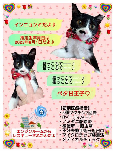 | イベント内容 | 【秘密結社ねこのひげ♡保護猫譲渡会】 11/19(日) 13:00~16:00 さいたま市緑区美園1-11-1 カインズホーム浦和美園店2F DIYカルチャー教室スペース内 にて保護猫譲渡会を開催します☆ ワラワラワラワラ仔猫祭継続中! まだまだ子猫だにゃー!なヤング猫や 小童には負けへんでー!なオトナ猫も♪ 合計15頭ほどが参加予定です♪ 未来のご家族さまと 愛し愛されな 両想いになれますように♡ 家族にするなら保護猫だべ♪♪ こんなご時世だけど 新しい家族と笑顔で暮らしたい♪ という方は是非会いにいらしてください♡ ご不明な点がございましたら インスタグラム @秘密結社ねこのひげ の DMまでお問い合わせ下さい☆ |