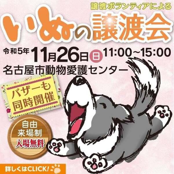 | イベント内容 | 11/26(日)譲渡ボランティアによる犬の譲渡会にファミーユも参加させていただきます! 開催時間は11:00-15:00となります。 参加メンバーは随時更新します! 是非チェックしてくださいねウインク 【犬の里親募集】「犬の里親」になっていただける新しい飼主さんへ、犬の譲渡会開催のお知らせです。 譲渡ボランティアによる犬の譲渡会を令和5年11月26日(日)、名古屋市動物愛護センターにて開催します。バザーも同時開催します。 この譲渡会は入場無料・自由来場制です。 予約は不要です。 お気軽にお越しください! 詳しくは当団体HPにてご確認ください。 |