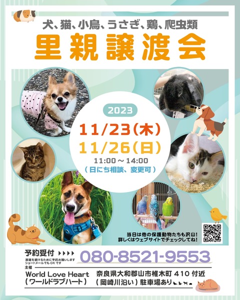 | イベント内容 | ワールドラブハートで里親募集中の動物たちの譲渡会を開催します! 犬猫だけではなく、インコやラット、ウサギにモルモットなどたくさんの保護動物がいます! みんな新しい家族を探しています。写真だけでは伝えきれない魅力が盛りだくさん! 実際に会ってそのかわいさを実感してください♪ ★里親募集中の動物たち★ https://satoya-boshu.net/foster/?@button_name@=search&FosterParent_MemberID=1161 ・犬、猫 ・ウサギ ・モルモット ・インコ ・キンカチョウ ・ウコッケイ ・ヘビ ・カメ ……など 子犬や子猫もたくさんいますよ♡ ぜひお気軽にお越しください! ●混雑をさけるために、事前予約をお願いします。 予約番号080-8521-9553 ショートメールでも可♪ ●当日までに譲渡が決定した・体調がすぐれないなど、やむを得ない理由で不参加の場合があります。ご希望の子がいましたら、当日お問い合わせください。 ●当日、その場での引き渡しはしておりません。譲渡決定後、自宅訪問を兼ねてこちらからお届け致します。 ご来場お待ちしております♪ ★world love heart(ワールドラブハート)は、奈良県大和郡山市で活動している動物保護団体です。 『引き取り依頼は断らない』をモットーに、犬、猫、鶏、小動物、家畜、爬虫類など捨てられた動物を保護しています。 https://worldloveheart-nara.jimdofree.com |