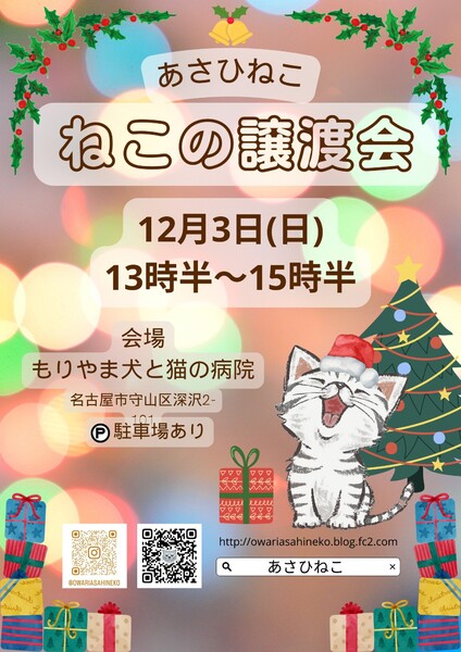 | イベント内容 | 譲渡会を開催します! 優しい家族を待っている猫たちが 沢山参加します(=゚ω゚=) ♡猫を迎えたい ♡運命の猫ちゃんと出会いたい ♡先住猫ちゃんの仲間探し 皆様のご来場をお待ちしております! 2023年12月3日(日) 13:30〜15:30 ※毎月第1日曜日 会場 もりやま犬と猫の病院 2F 愛知県名古屋市守山区深沢2-101 駐車場あり ※病院へのお問い合わせはご遠慮下さい お問い合わせはコチラ ma47m@yahoo.co.jp ┈┈┈┈┈┈┈┈┈┈ ◎全頭ワクチン接種、ウイルス(FIV、FeLV)検査、マイクロチップ装着済み ◎譲渡には条件がございます 詳しくは下記ブログをご覧ください ↓↓↓ 主催者【あさひねこ】ブログ http://owariasahineko.blog.fc2.com/ |